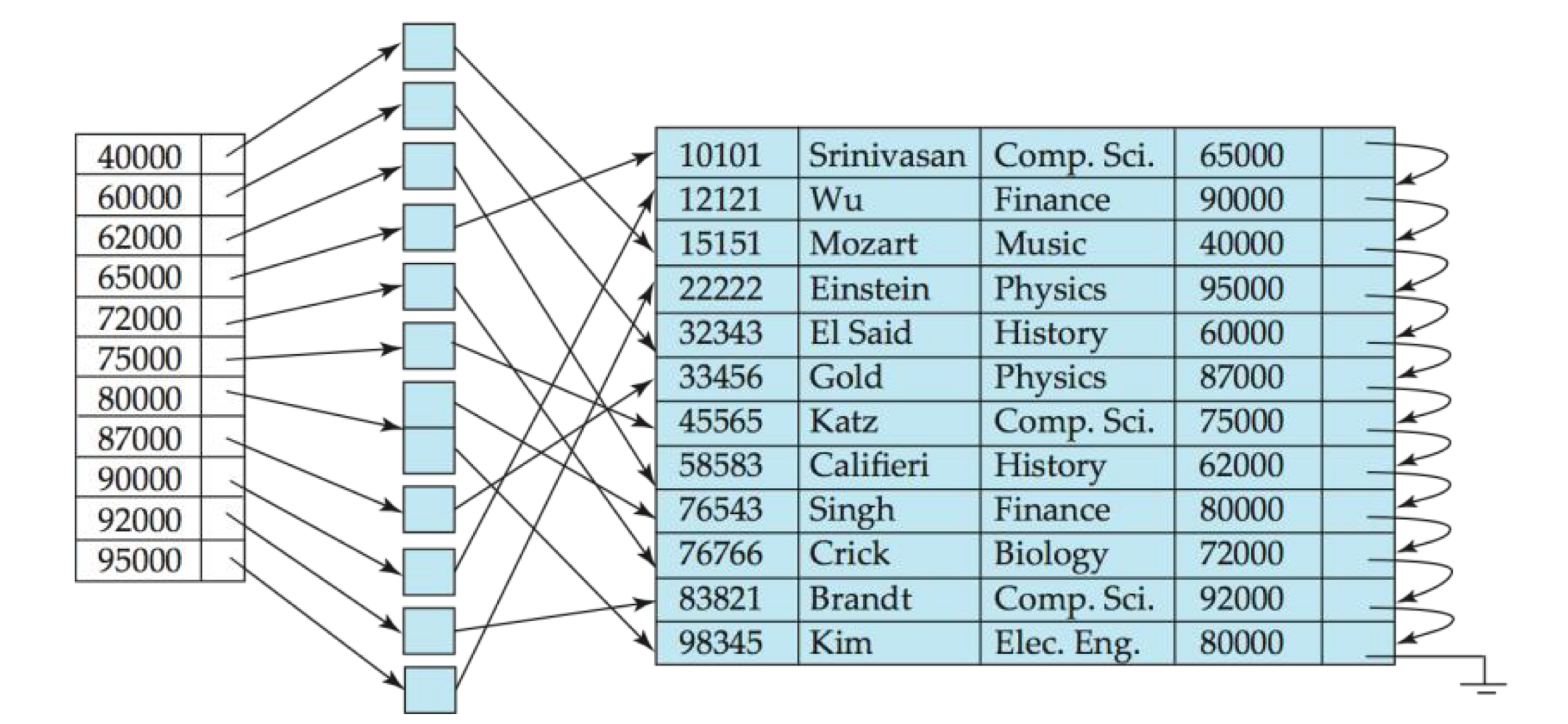 2. Cost = (Hi+n) * (Tt + Ts) ( n은 전체 레코드의 개수 ) 입니다. 이 역시 아까와 비슷하지만, 블록을 추가적으로 가져오냐, 레코드 전체를 가져오냐의 차이가 있습니다. secondary index는 기본적으로 dense 하지만, 인덱스와 연결되어 있는 테이블이 정렬되어 있다고 보장할 수 없습니다. 심지어 다른 메모리 블록에 위치할 수도 있기 때문에, 전체 레코드를 조회하여 일일히 비교해야 하는 상황이 발생합니다.