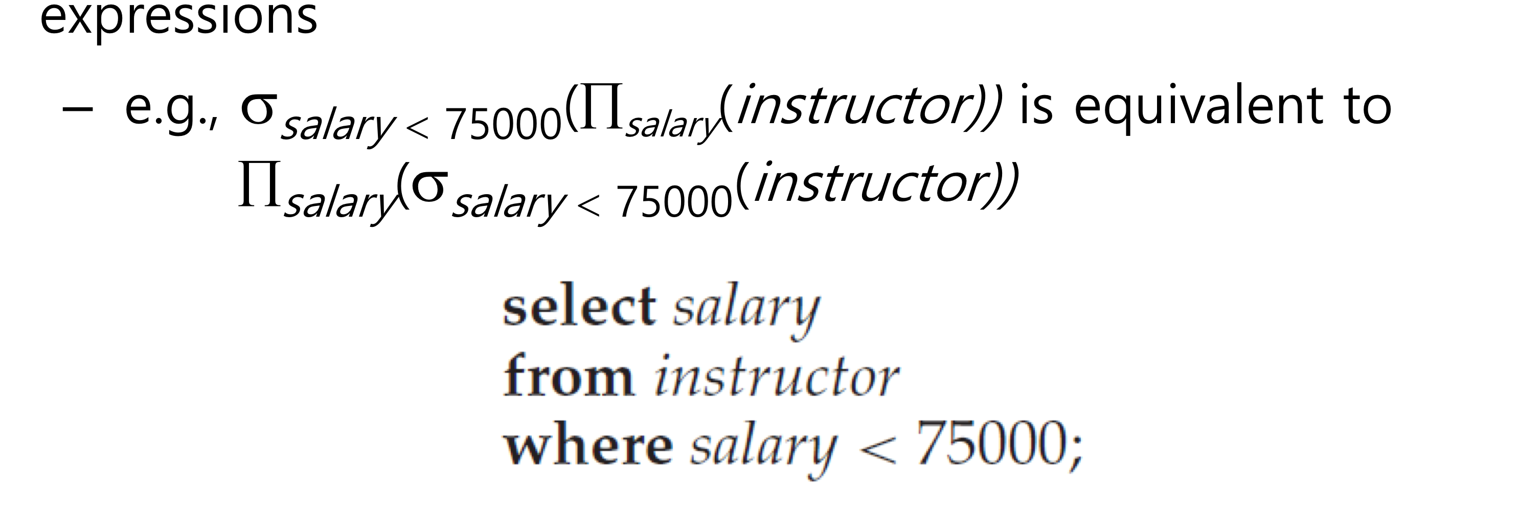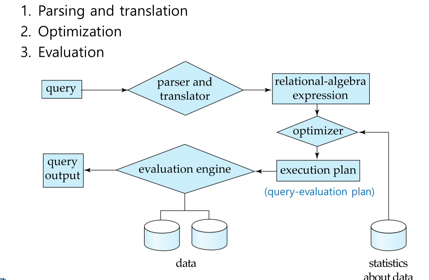 - 관계 대수 표현식으로 변환 (parsing -> 문법 체크 and translation -> 관계대수로 번역)