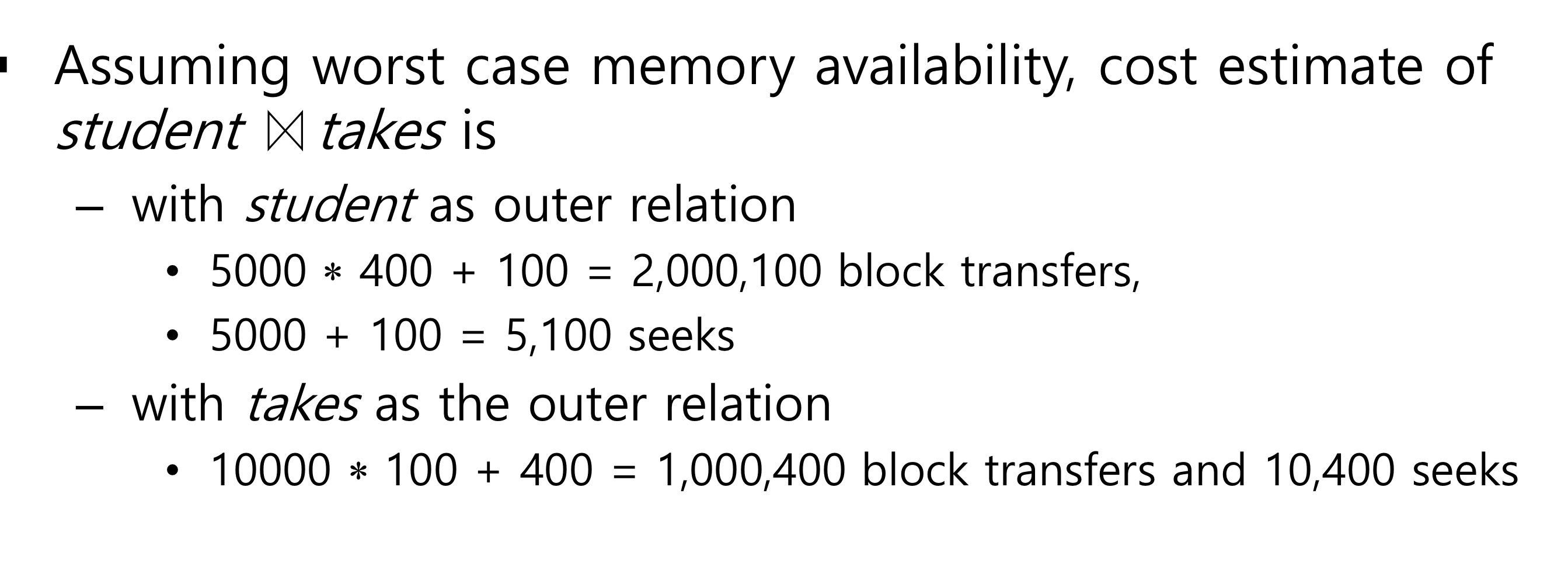 Block nested loop join 을 사용하면 400 * 100 + 100 = 40100 block transfer + 2 * 100 = 200 seek 이고,