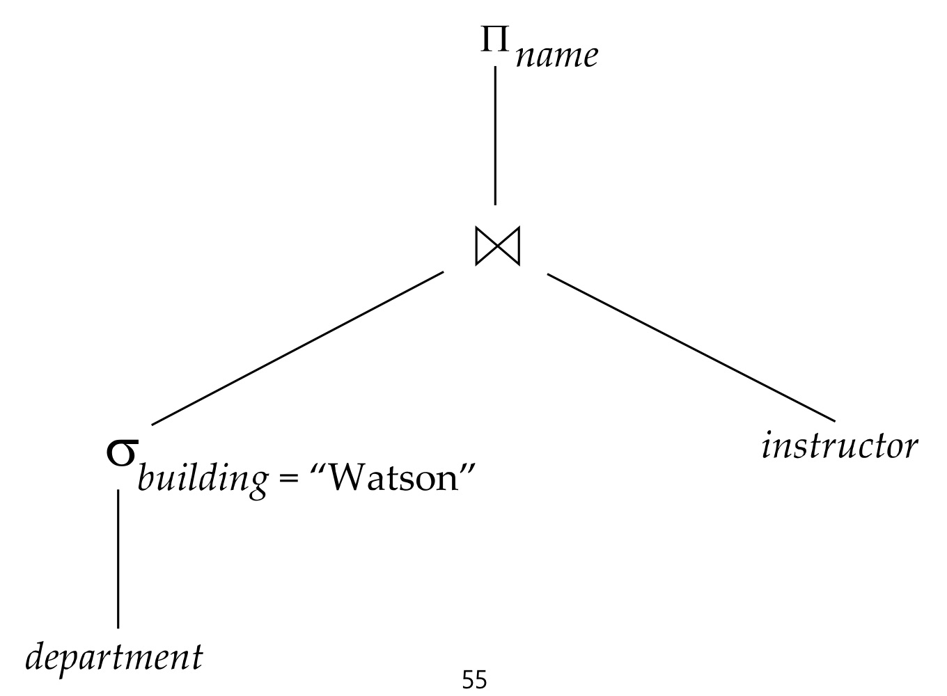 위의 예시를 들어보겠습니다. π<name>(σ<building=“Watson”>(department))⋈instructor)